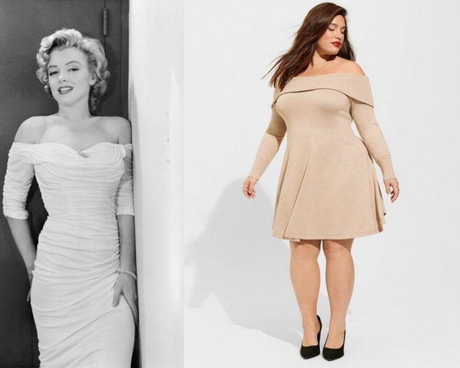 This mini fluted sweater dress may be loosely based on Marilyn’s off-shoulder number from her first LIFE cover shoot with Philippe Halsman…