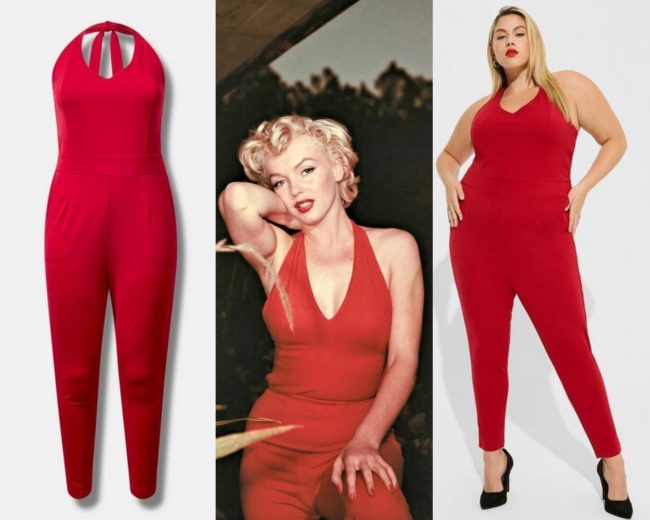 While this halter tapered jumpsuit (available in red or black) is seemingly influenced by Marilyn’s attire for a 1954 layout with photographer Baron.