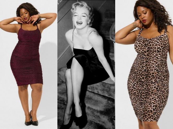 Torrid, the US clothing franchise for plus-size women – and an offshoot of Hot Topic – has launched a Marilyn-inspired line in partnership with her estate. Items on offer include this midi surplice tie-back georgette dress, in homage to the iconic Travilla halter dress from ‘subway scene’ in The Seven Year Itch (worn with a black faux-fur stole, sold separately.)