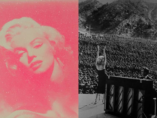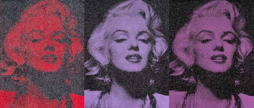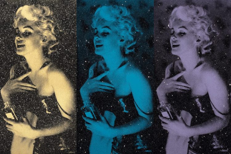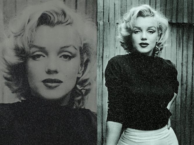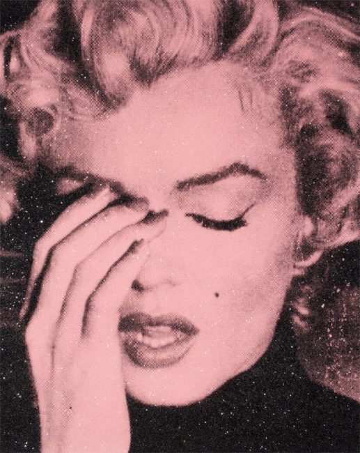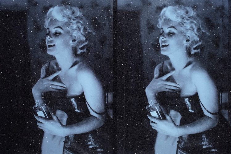Marilyn is among the 20th century icons featured in pop artist Russell Young’s latest exhibition, Dreamland, now open at London’s Maddox Gallery until February 7, 2024. Seen above, ‘Marilyn Chanel Diptych’ is an acrylic, oil based ink and diamond dust hand-pulled screenprint on linen. It is based on a 1955 photo of the star dabbing her favourite perfume, and influenced by Andy Warhol’s ‘Marilyn Diptych’ created after her death in 1962.