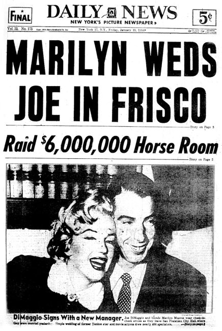 ‘MARILYN WEDS JOE IN FRISCO,’ blared the Daily News headline above a photo of the two stars smiling cheek-to-cheek after leaving City Hall captioned, ‘DiMaggio Signs With a New Manager.’