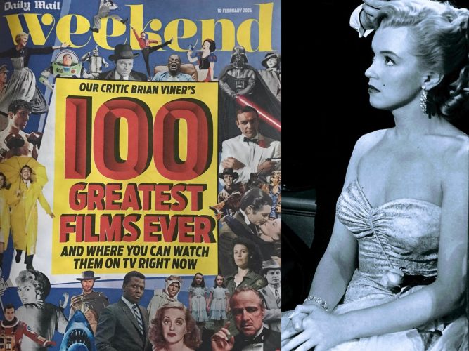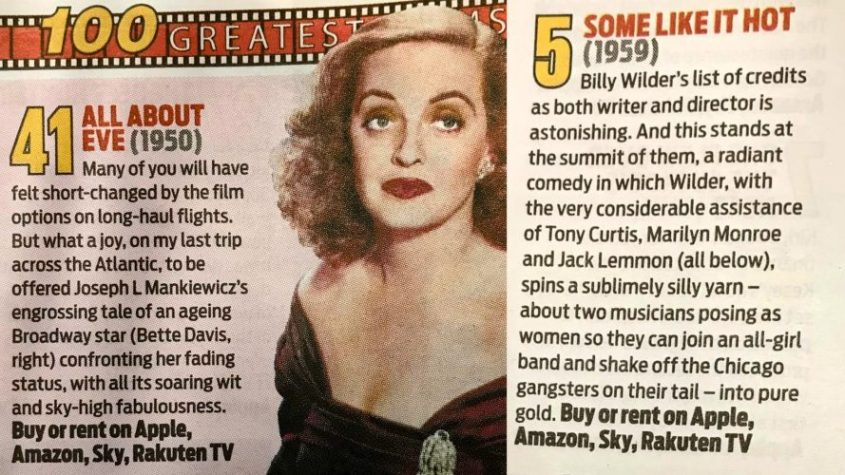 Marilyn makes two appearances in Brian Viner’s list of the 100 Greatest Films Ever for the Weekend supplement in today’s UK Daily Mail. Her breakthrough movie All About Eve (1950) comes in at #41, while Some Like It Hot (1959) is ranked in fifth place.