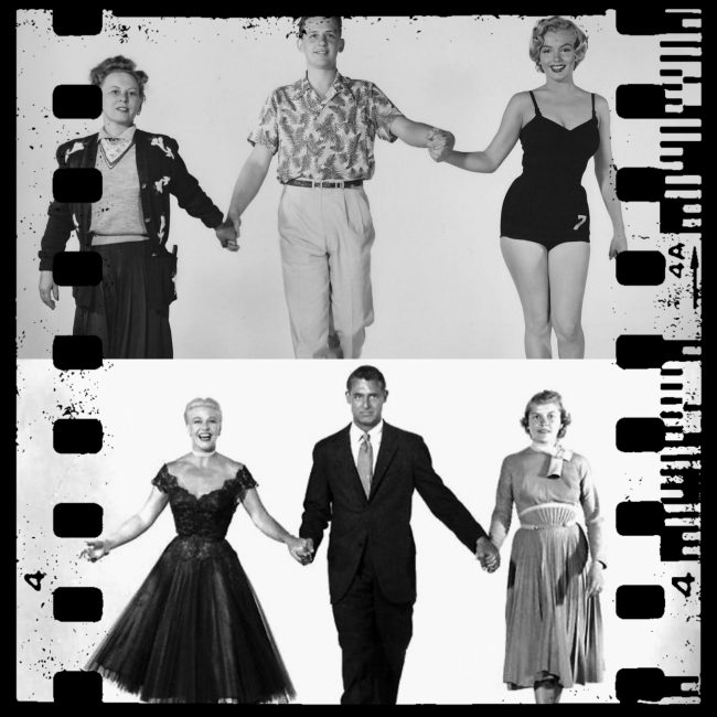 It wasn’t an uncommon practice to use stand-ins for cast photos, with the absent stars transposed onto the image before publication. Back in 1952, Marilyn had posed in a black bathing suit with stand-ins for her Monkey Business co-stars, Ginger Rogers and Cary Grant – who were later photographed with a stand-in wearing Marilyn’s pleated Travilla dress.