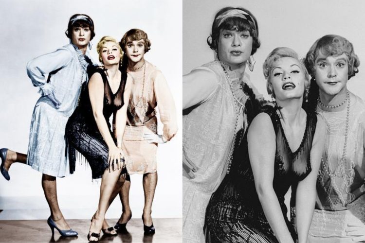 However, diehard fans will know it’s not Monroe with Curtis and Lemmon in the Mail‘s colourised Some Like It Hot photo, but Sandra Warner – wearing an Orry-Kelly dress from Marilyn’s ‘I’m Through With Love’ number. Sandra, a successful model and singer who also played a member of Sweet Sue’s band in Some Like It Hot, was called in to replace a visibly pregnant Marilyn for the publicity layout.