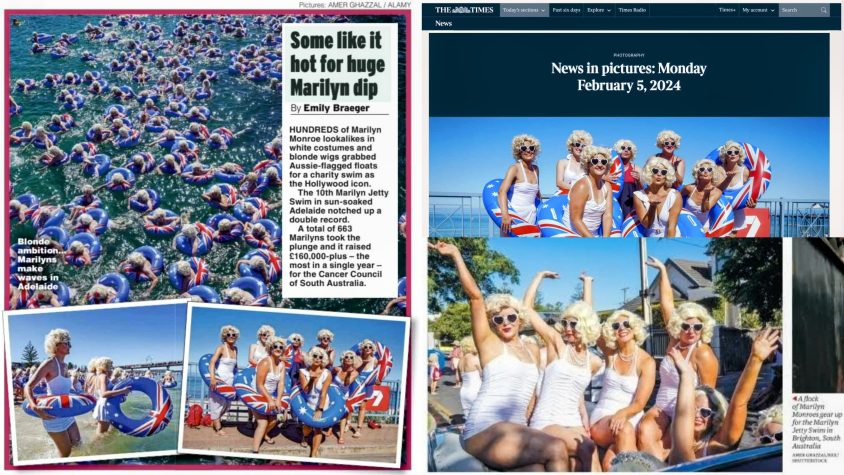 The annual Marilyn Jetty Swim on Brighton Beach, Adelaide reconvened on Sunday, February 3rd, attracting its largest number yet with 664 ‘Marilyns’ raising over $338,000 for Cancer Council South Australia, as ABC News reports.