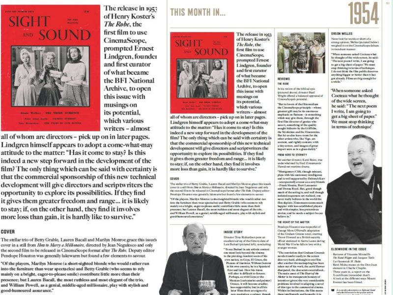 Sight & Sound has sometimes been accused of elitism, and that may have been a fair criticism back in 1954. How to Marry a Millionaire, like most of Marilyn’s films from this period, was dismissed as mere Hollywood fluff. Incidentally, biblical epic The Robe – the second film made in CinemaScope, but released before Millionaire – was deemed worthy of a feature (but not the cover.)