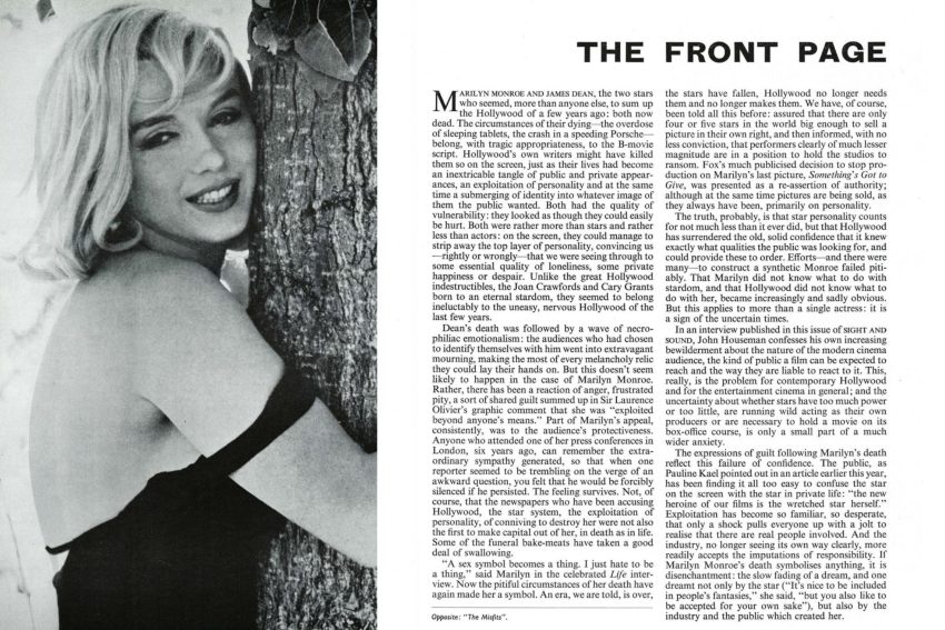 The American critic Arlene Croce’s rather scathing essay on The Misfits (Summer 1961) spared Marilyn the worst, saving her venom for Arthur Miller. And finally, Marilyn’s untimely death was noted in Houston’s editorial for Autumn 1962.