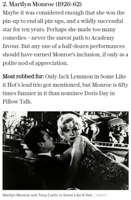 And finally, Marilyn’s performance as Sugar Kane in Some Like It Hot (which won her a Golden Globe) makes her the highest placed woman – and second only to Edward G. Robinson in Double Indemnity – on Telegraph film critic Tim Robey’s list of 20 Great Actors Who’ve Never Been Nominated for an Oscar. (Marilyn’s Niagara co-star, Joseph Cotten, also gets a nod for his prior role in The Third Man.)