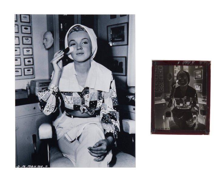 Original negative from Edward Cronenweth‘s 1948 photo of Marilyn in the make-up department of Columbia Pictures. The negative came from the archives of a Los Angeles movie magazine company.