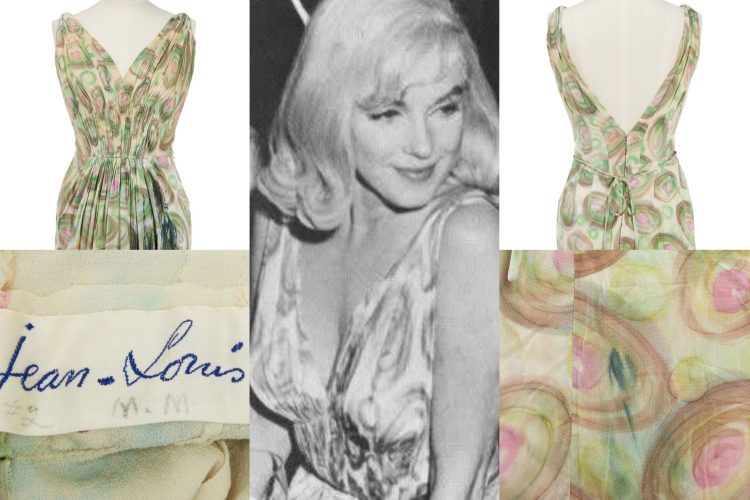 An original Jean Louis painted-silk jersey cocktail dress worn by Marilyn Monroe for The Misfits cast press conference in the summer of 1960.