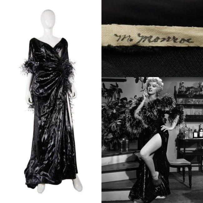 A three-piece ensemble custom-made for Marilyn by Travilla, in fragile condition and with signs of repair work. (Although the listing describes it as a costume for There’s No Business Like Show Business, it may have been intended for the fashion-show scene in How to Marry a Millionaire. Marilyn never wore this ensemble on the screen, however.)