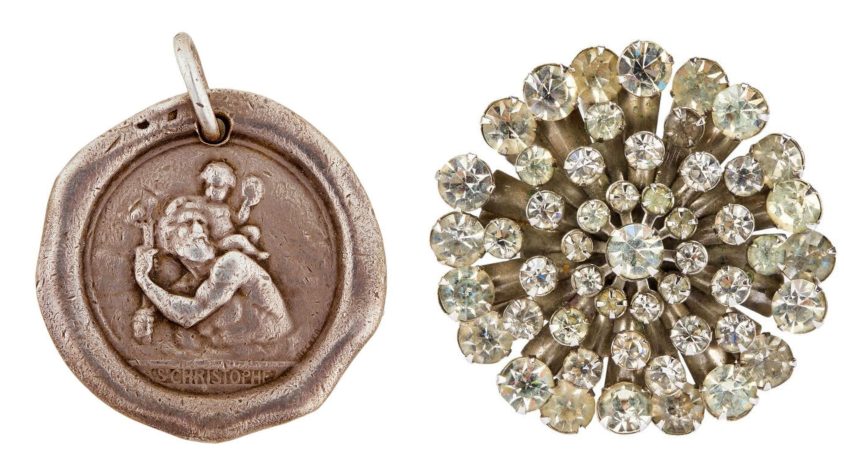 “At left, a silver-tone St. Christopher pendant in the style of a wax seal given to Ralph Roberts by Marilyn. According to Roberts, Natasha Lytess, Monroe’s early acting coach, gave her the medal. Monroe. When she gave Roberts the medal she stated, ‘I’ve outgrown Natasha.'”