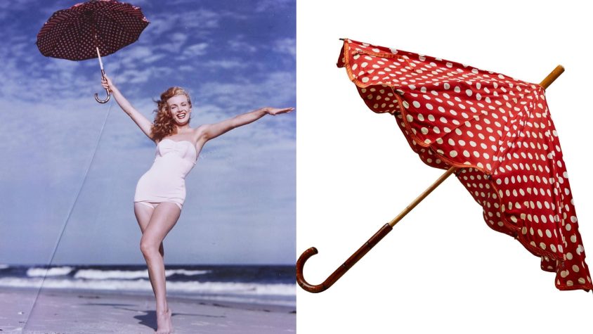 A red and white polka-dot umbrella with a wood hook handle used by Marilyn in a 1949 photo shoot with photographer Andre de Dienes, during her first visit to New York.