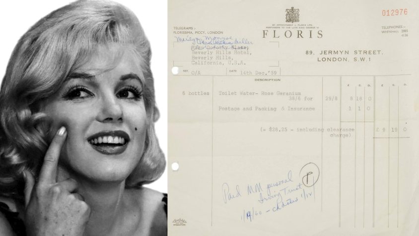“A receipt from Floris of Jermyn Street in London dated December 14, 1959, listing Marilyn Monroe Miller of The Beverly Hills Hotel as the purchaser of six bottles of rose geranium toilet water for a total of $28.25, including the clearance charge. The invoice is marked as paid by Monroe’s personal checking account on January 19, 1960.”