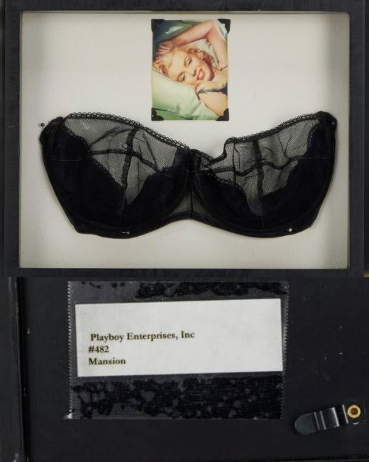 A shadowbox frame containing a Marilyn-owned black lace and satin under-wire brassiere with lace cups. This piece was among the items originally selected for sale in Christie’s 1999 auction, but it was not in the final selection. It was subsequently sold through Julien’s 2005 follow-up auction, and purchased by Playboy Enterprises.