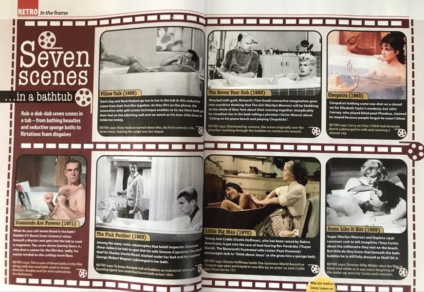 But it’s her two Billy Wilder comedies that put her on a list of ‘Seven Scenes … in a Bathtub’ in the March issue of UK nostalgia mag Yours Retro (#72, with Doris Day on the cover.) In The Seven Year Itch (1955), Marilyn calls a plumber after getting her toe stuck in the tap. And in Some Like It Hot (1959) it’s Tony Curtis who makes a splash, with Marilyn and Jack Lemmon looking on.