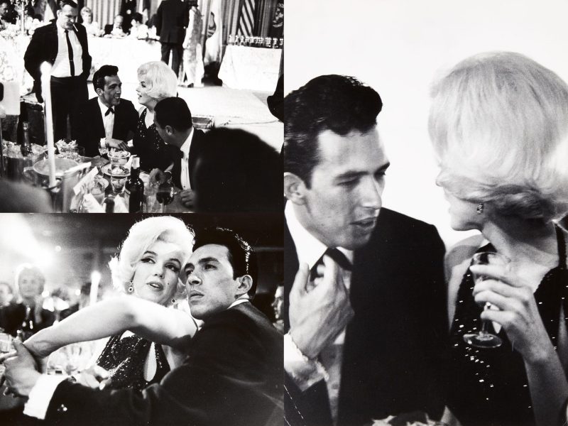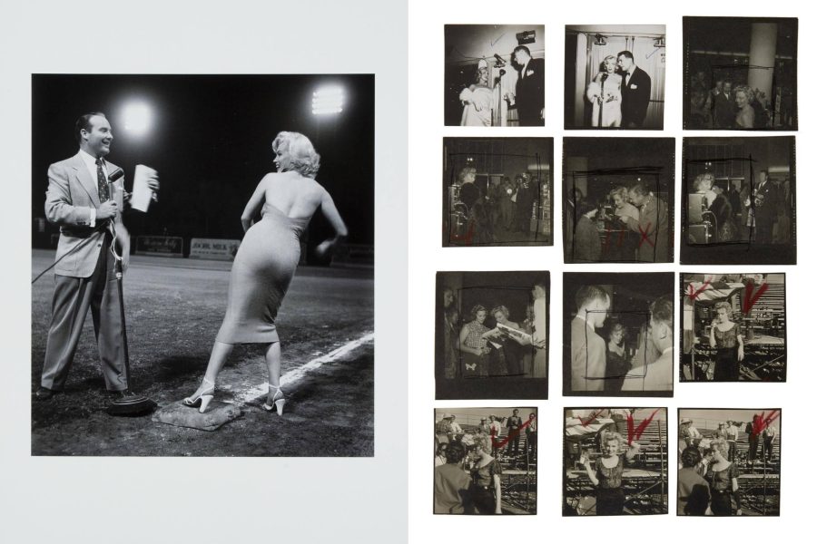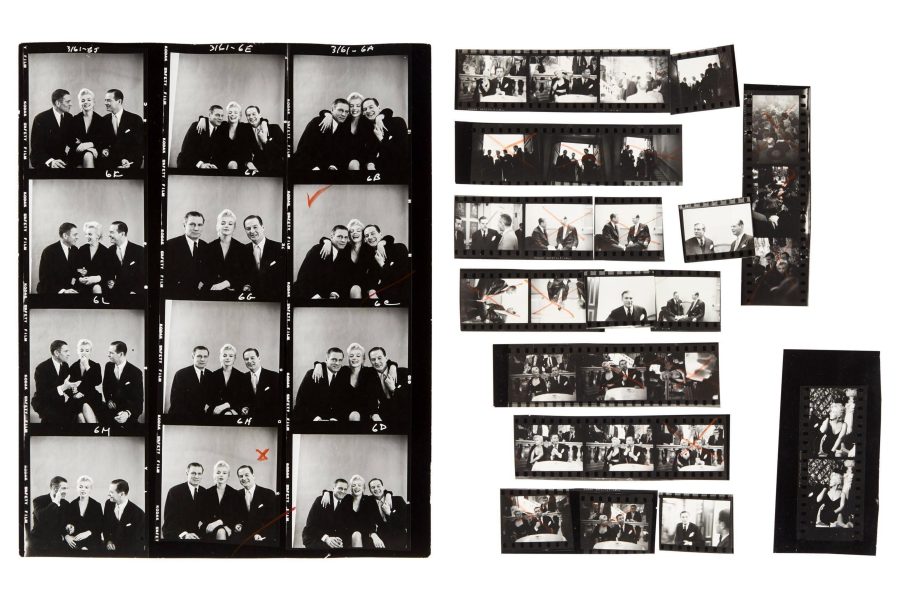 At right: “A group of 12 vintage contact prints of Marilyn Monroe. Two were taken in March 1953 at the premiere of Call Me Madam with radio and television personality Ken Murray but are stamped on the back with ‘Dec 1952.’ Six were taken in 1952 at a Los Angeles drugstore where Monroe was autographing the 1952 Life magazine that featured her photo on the cover. Four were taken in 1956 on location in Phoenix, Arizona, during filming of Bus Stop.”
