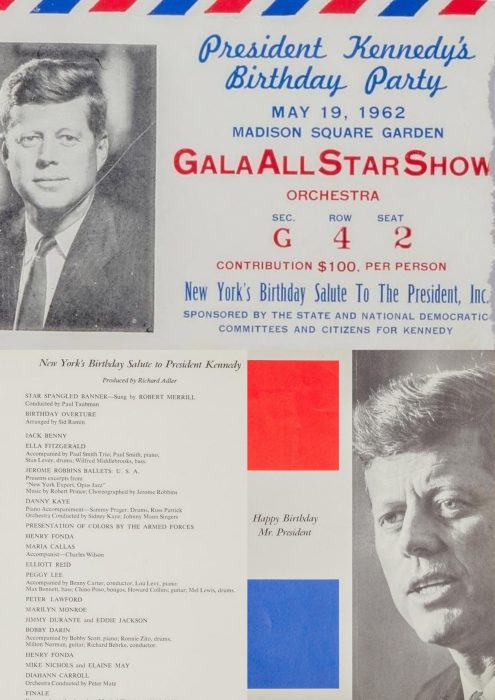 “An original ticket stub and program for the May 19, 1962 event ‘New York’s Birthday Salute to President Kennedy.’ The ticket is for the Orchestra section G row 4, seat 2. The event took place at Madison Square Garden and featured a lineup that included Marilyn Monroe, Ella Fitzgerald, Peggy Lee, Maria Callas, Mike Nichols and Elaine May, and Diahann Carroll. The star-studded celebration was held 10 days before Kennedy’s actual birthday, and was sponsored by the Democratic Committees and Citizens for Kennedy as a fundraiser to erase debt incurred during the 1960 presidential election. Monroe famously flew to New York to perform a sultry rendition of ‘Happy Birthday, Mister President.'”