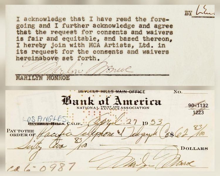 Above, at top: ‘A signed copy of a letter to the Screen Actors Guild on MCA letterhead, that’s dated January 1953 and signed by Marilyn and Lew Wasserman … The letter requests an acknowledgement of the change in representation for Monroe from the William Morris Agency to MCA under the supervision of Lew Wasserman, who later became the president of the Screen Actors Guild. Johnny Hyde, executive vice president of William Morris and the man credited with launching Marilyn’s film career, had passed away in 1950. The loss of Hyde may have precipitated the change.”