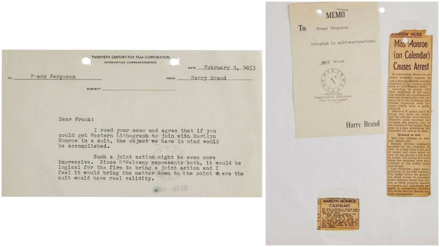 The memos are dated February 6-23, 1953 and are between Harry Brand, Twentieth Century Fox’s publicity director, and Frank H. Ferguson, the studio’s assistant secretary, and the subject field is typed with the words ‘Marilyn Monroe.’ Attached are two vintage newspaper clippings, one with the headline ‘Marilyn Monroe Calendars’ and the other ‘Miss Monroe (on Calendar) Causes Arrest.'”