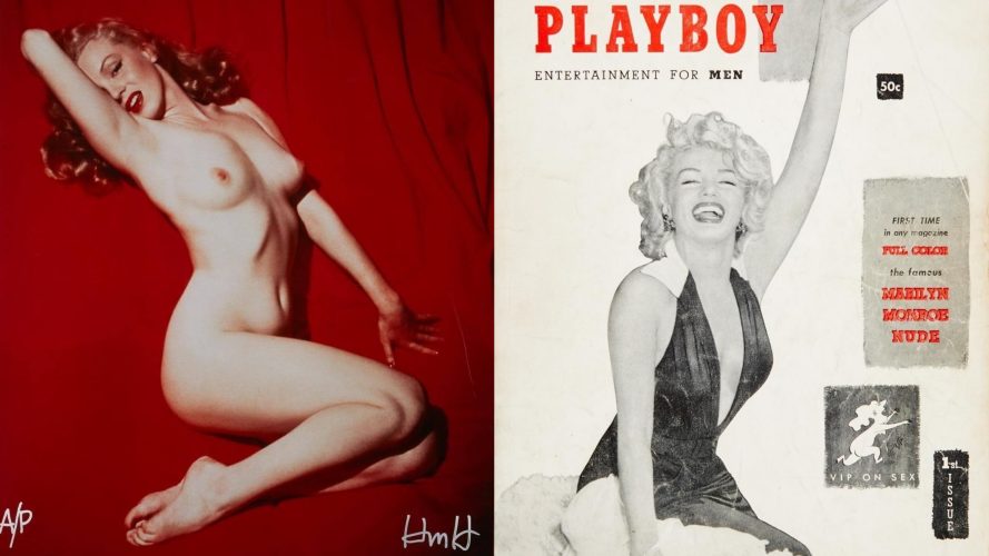 At left: Artist proof print featuring an image of Marilyn Monroe from Tom Kelley‘s famous 1949 Red Velvet photo session initialed lower right in by Hefner ‘HMH’.