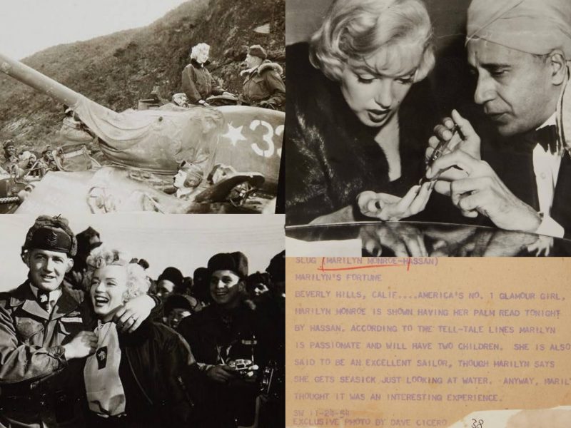At right: a press photo of Marilyn visiting Hassan, a palm reader (SOLD. The image was captured by Dave Cicero on November 24, 1954. The official caption titled ‘Marilyn’s Fortune’ is affixed to the verso.