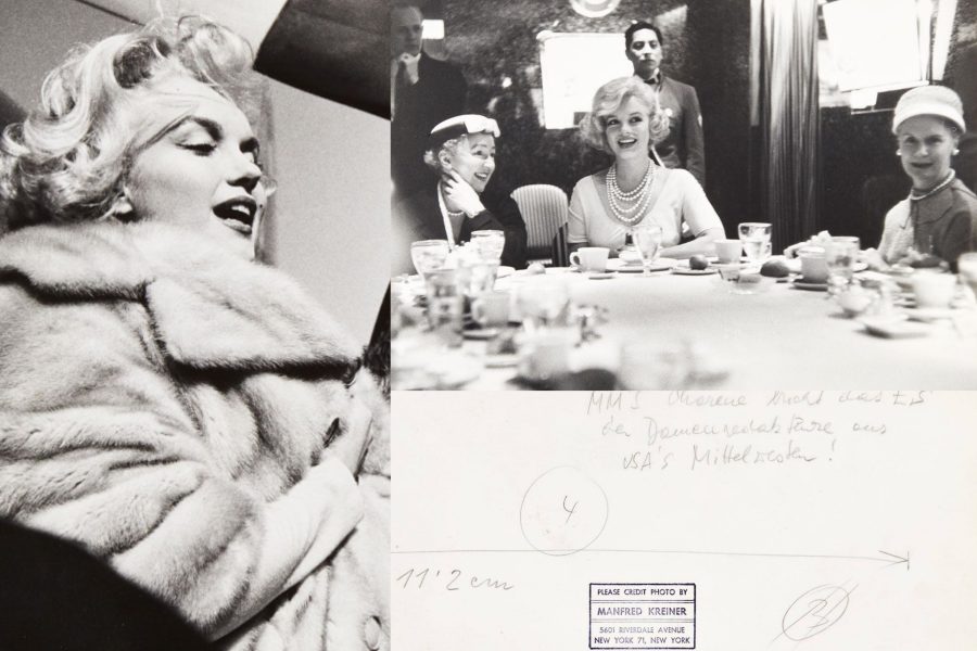 At right: Oversize photo of Marilyn with columnists at a ladies’ luncheon in the Ambassador East Hotel during the Chicago trip, with a handwritten caption in German on the verso.
