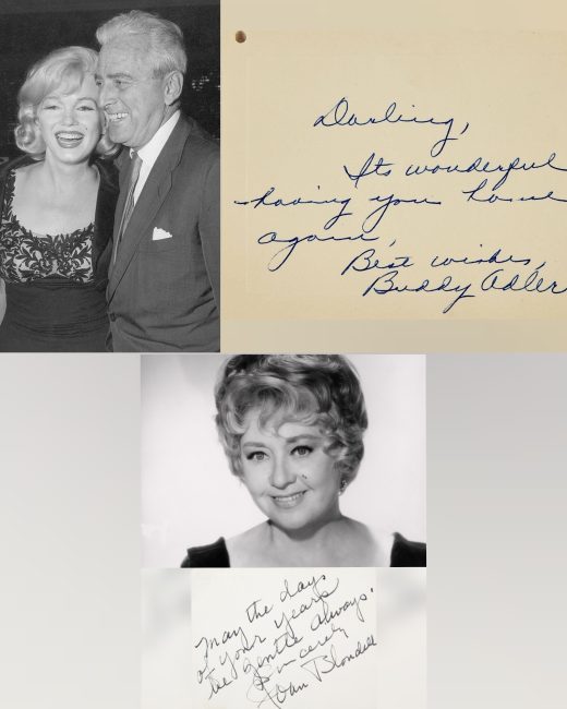 At bottom: A small note card with embossed letters sent to Marilyn by actress Joan Blondell, reading ‘WADLEY & SMYTHE, NEW YORK.’ The handwritten note on the card reads, ‘May the days of your years be gentle always.’