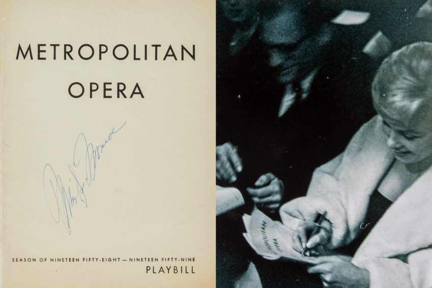 A Metropolitan Opera playbill from the 1958-1959 season that’s been signed by Marilyn in blue ink and is accompanied by a photo of Marilyn signing a playbill. This is believed to have been signed on February 10, 1959, when Marilyn and her husband Arthur Miller attended a performance of Macbeth.