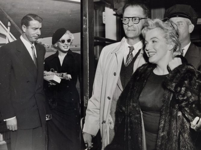 At left, Marilyn and Joe DiMaggio on their ‘honeymoon tour’ of Japan, from DiMaggio’s personal collection. However, this photo was not taken when they first arrived in Tokyo on February 1st, 1954 as the listing states, but at Iwakuni Airport on February 11. And at right, Marilyn and Arthur Miller arriving at Idlewild Airport, photographed by Sam Goldstein on November 21, 1956. The newlyweds were returning from their four-month stay in London, where Marilyn filmed The Prince and the Showgirl, and Arthur oversaw the West End production of A View From the Bridge.