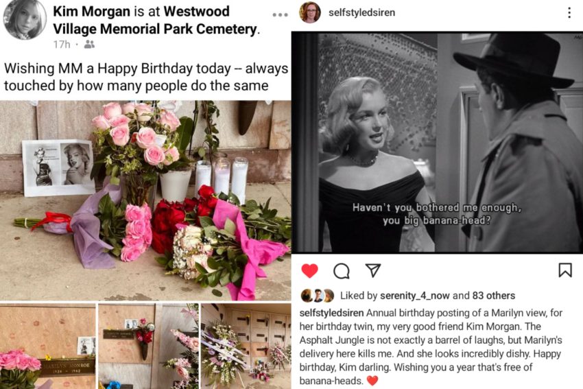 And finally, another birthday girl – film critic Kim Morgan, who wrote about Marilyn here) – was one of many fans visiting her grave yesterday.