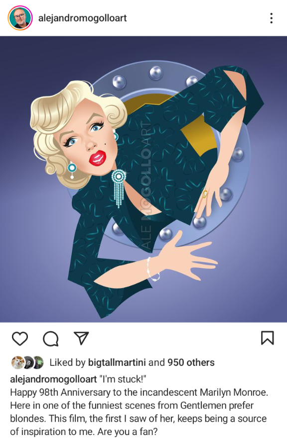 Spanish artist Alejandro Mogollo paid tribute to Marilyn’s hilarious ‘porthole scene‘ from Gentlemen Prefer Blondes.