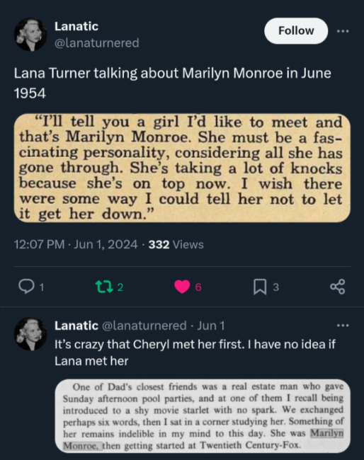 And talking of Hollywood legends, Lanatic dug into the archive for Lana Turner‘s thoughts on fellow blonde MM.