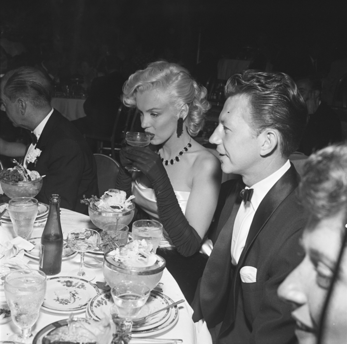 Marilyn is shown above right at the Cocoanut Grove, a legendary nightclub then located in the basement of the Ambassador Hotel on Wilshire Boulevard, on January 1st, 1953. The hotel – which also housed the Blue Book Model Agency, where Marilyn’s career began – was demolished in 2006.