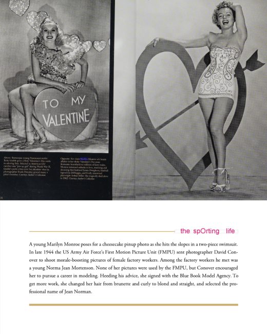 Mary Mallory’s books include Hollywood Celebrates the Holidays (see below, at top), which shows Marilyn and Betty Grable in cheesecake poses for Valentine’s Day; and Hollywood at Play (at bottom), which includes an early modelling shot of Marilyn ‘skiing’ on sand in a two-piece bathing suit.