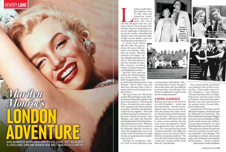 Marilyn’s time in England while filming The Prince and the Showgirl in 1956 was featured in last week’s issue of Closer USA (dated August 5, with Elizabeth Taylor on the cover), which has now reached UK shores. The article is based on an interview with Michelle Morgan, author of When Marilyn Met the Queen.