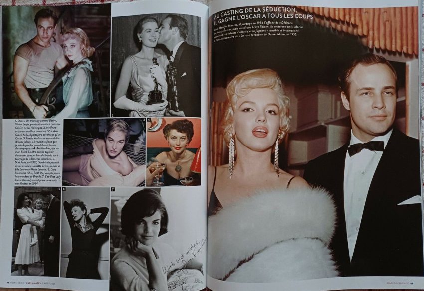 A new special magazine from Paris Match on movie legend Marlon Brando includes a feature on his many romances. His brief affair with Marilyn – which led to a lasting friendship – is documented with this photo of the pair serving as celebrity ushers for the premiere of The Rose Tattoo, a fundraiser for the Actors Studio, in December 1955.