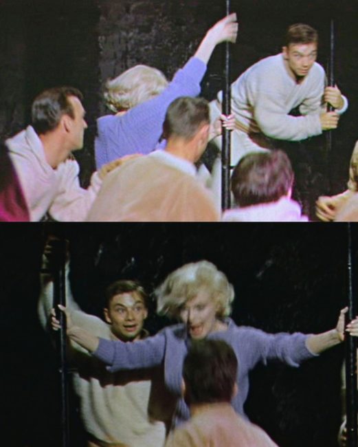 Marilyn finally throws off her sweater, and slides down a pole in her black bodystocking. As the song comes to an end, she turns and kisses a flabbergasted Banas, whose elfin features and boyish innocence contrast with the other ‘daddies.’