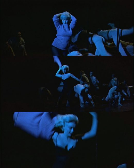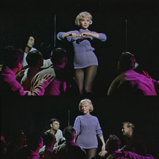 The number is staged as the rehearsal for an off-Broadway revue, with Marilyn and her dancers wearing bulky sweaters, overlooked throughout by leading man Yves Montand and Tony Randall.