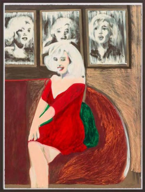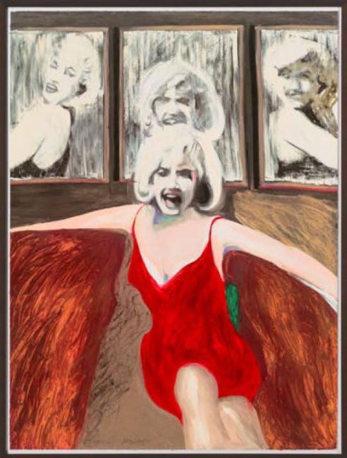 Marilyn’s red dress is similar to one she wore for the ‘Jump’ shoot with Philippe Halsman in 1959. Red is a colour which dominates all three paintings. Marilyn is sitting on the edge of a brown chair or couch, her arms circling the back of the chair and another to her left. The wood-brown seat is placed against a lighter brown wall, and the earth tones contrast with Marilyn’s pale skin and her vibrant red dress.