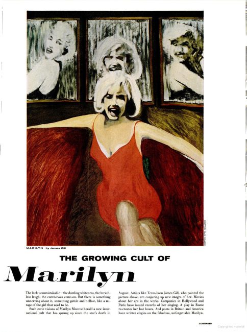 The first painting in Gill’s triptych was featured alongside works by William De Kooning, James Rosenquist, Derek Marlowe, and Pauline Boty in ‘The Growing Cult of Marilyn,’ a feature for LIFE magazine in early 1963. “The look is unmistakable – the dazzling whiteness, the breathless laugh, the curvaceous come-on,” the article read. “But there is something unnerving about it, something garish and hollow, like a mirage of the girl that used to be.”
