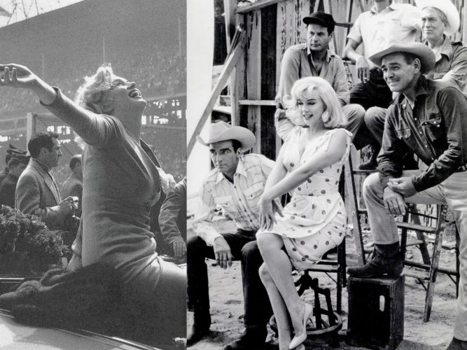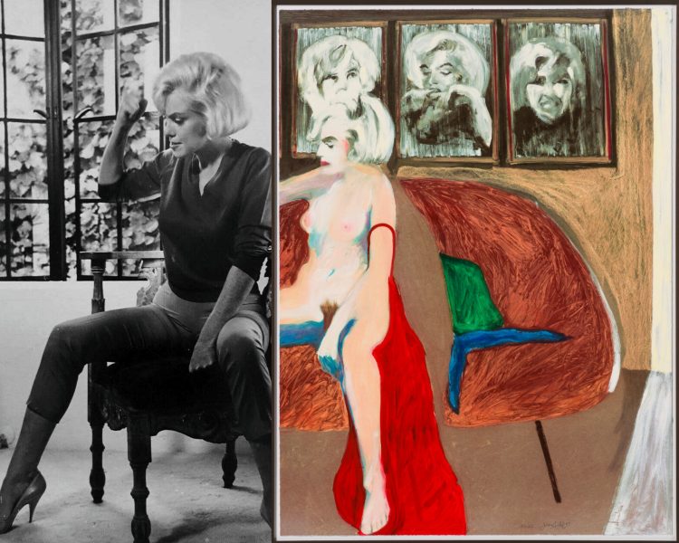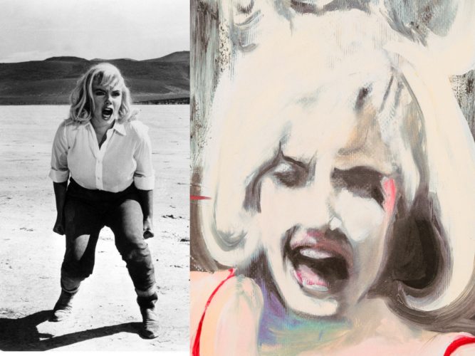 Overall, the painting recalls a dramatic speech she gave in The Misfits (1961), when she runs from the cowboys and decries their pursuit of wild horses in the Nevada desert. Marilyn’s last complete performance is also echoed in the second painting, with her main pose cropped from a cast photo.