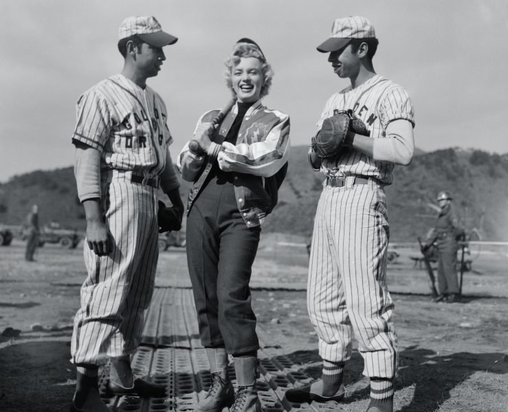 Marilyn tries her hand at baseball with brothers Ernest and Manuel Abril of the Golden Dragons military team. Back home in California, the Abril Twins also played with the Colton Mercuries.