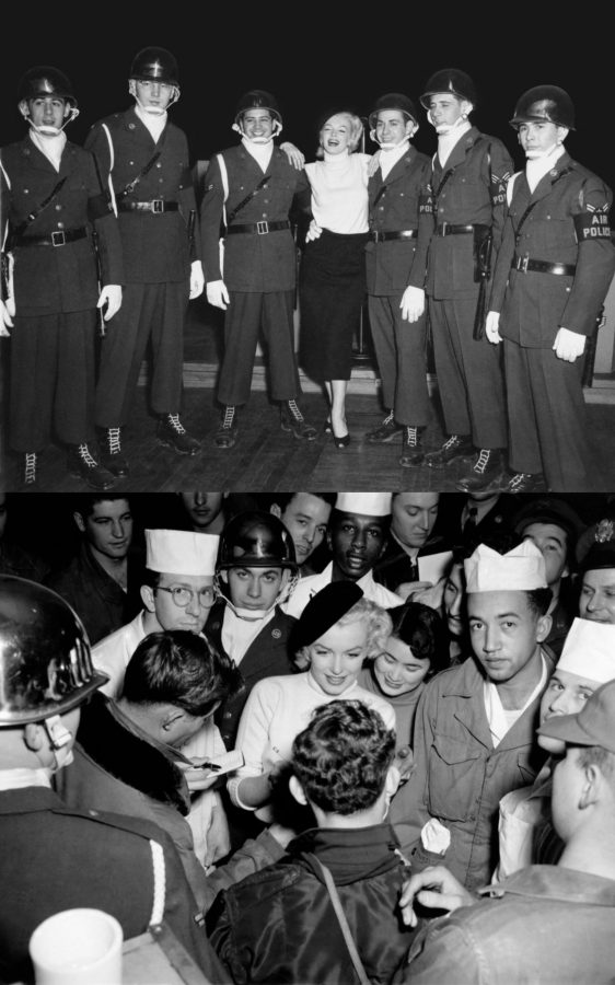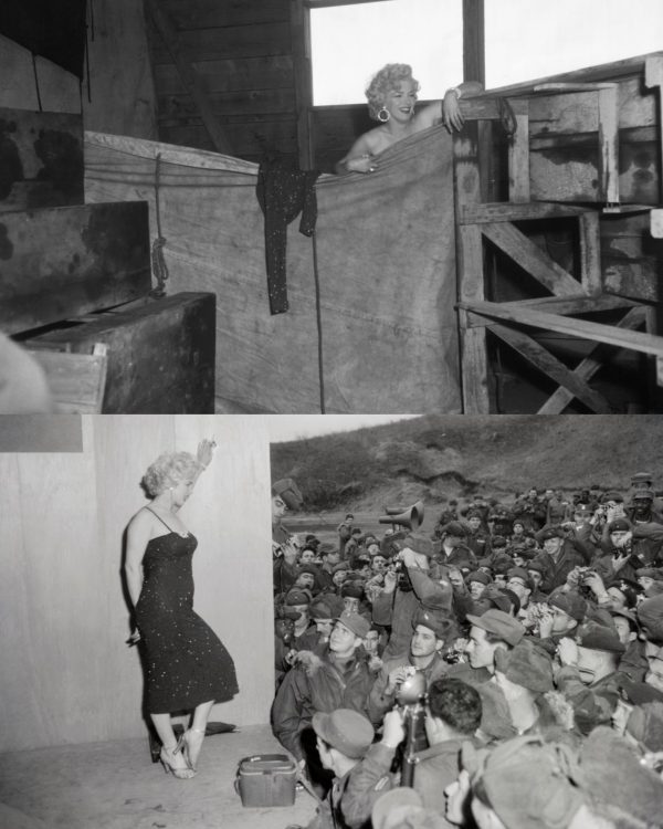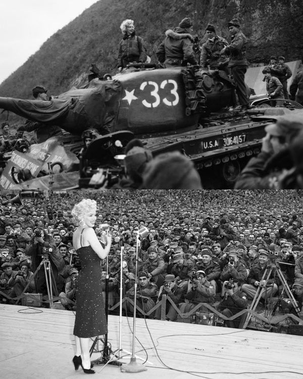 Marilyn in her makeshift dressing room at K-47 Air Force base in Chuncheon, Korea; and striking an alluring pose onstage.