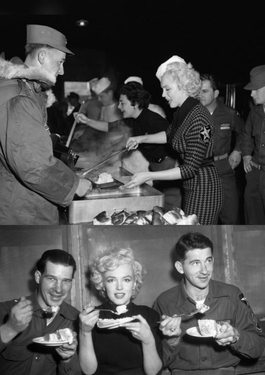 Above, at top: Marilyn serves lunch in a mess line to PFC James R. Goggin of Lesterville, Missouri, an army photographer. Next to Marilyn is Jean O’Doul, who accompanied her to Korea while their husbands remained in Japan.