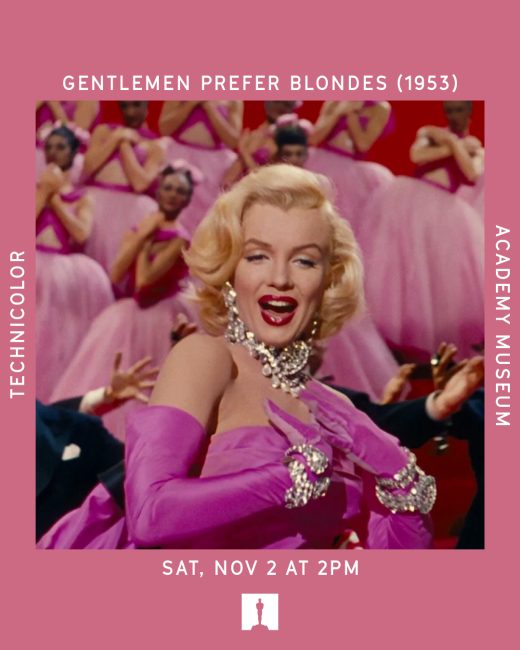 Marilyn graces posters for Colour in Motion, a new exhibition at the Academy Museum of Motion Pictures in Los Angeles, with Gentlemen Prefer Blondes showing next Saturday, 2 November, at 2:00 pm.