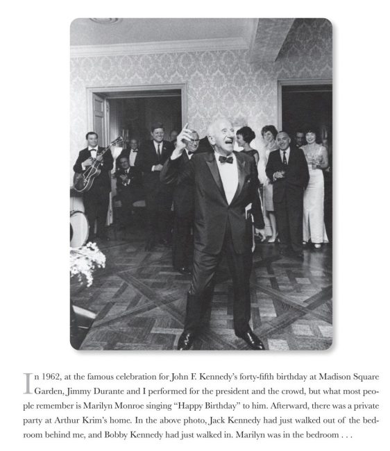 “I never had any proof that the Kennedy brothers had intimate relations with Marilyn Monroe, but it wouldn’t be beyond the realm of probability. Once at Arthur and Mathilde Krim’s house in New York, I joined an impressive gathering of movie stars and politicians. Marilyn was there. I saw her go into a private room with Jack. They stayed awhile, until he came out another door. Immediately, Bobby entered the room and stayed until the song that Jimmy Durante was singing was over. I have a picture of that night on my Wall of Life. Of course, the Kennedy brothers and Marilyn could have been talking about world affairs and comparing notes, but most of us thought it was the other kind of affairs they were interested in.”