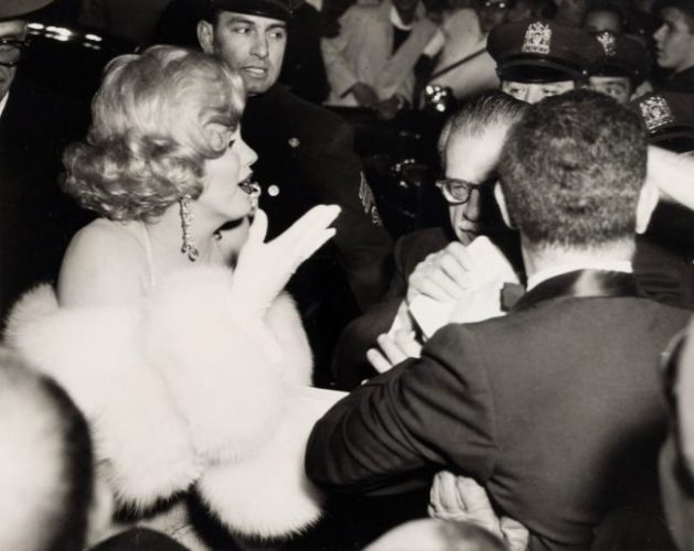 Marilyn greets the press at the premiere of Some Like It Hot at the Loew’s Capitol Theatre on Broadway on March 28, 1959, with Arthur Miller just visible to her left.