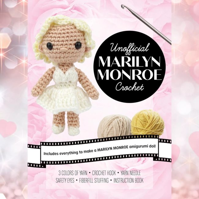 Amigurumi is the Japanese art of knitting or crocheting small, stuffed yarn creatures. An unofficial Marilyn Monroe Crochet Kit is now available, with an instruction book, needle and yarn included.
