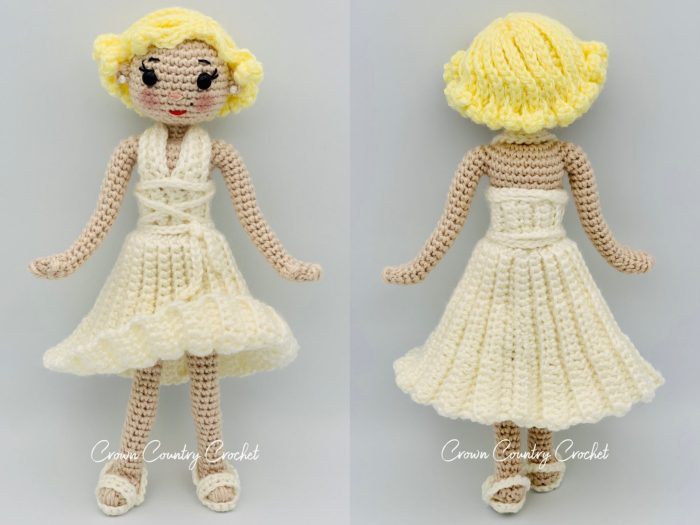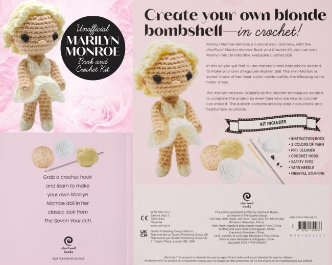 “The crochet instruction book includes everything you need to know to make your own amigurumi Marilyn doll. This mini Marilyn is styled in one of her signature outfits: the billowing white dress she wore over the subway grate in the 1955 film The Seven Year Itch. The instruction book explains all the crochet techniques used in the project so even fans who are new to crochet can enjoy it. The pattern contains step-by-step instructions and helpful how-to photos.”